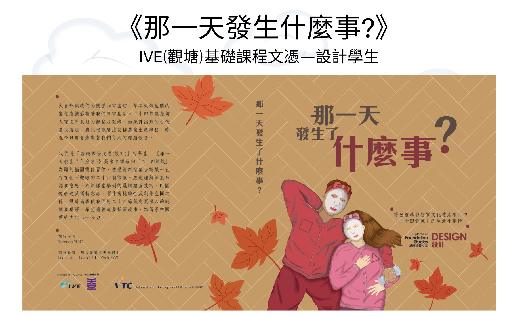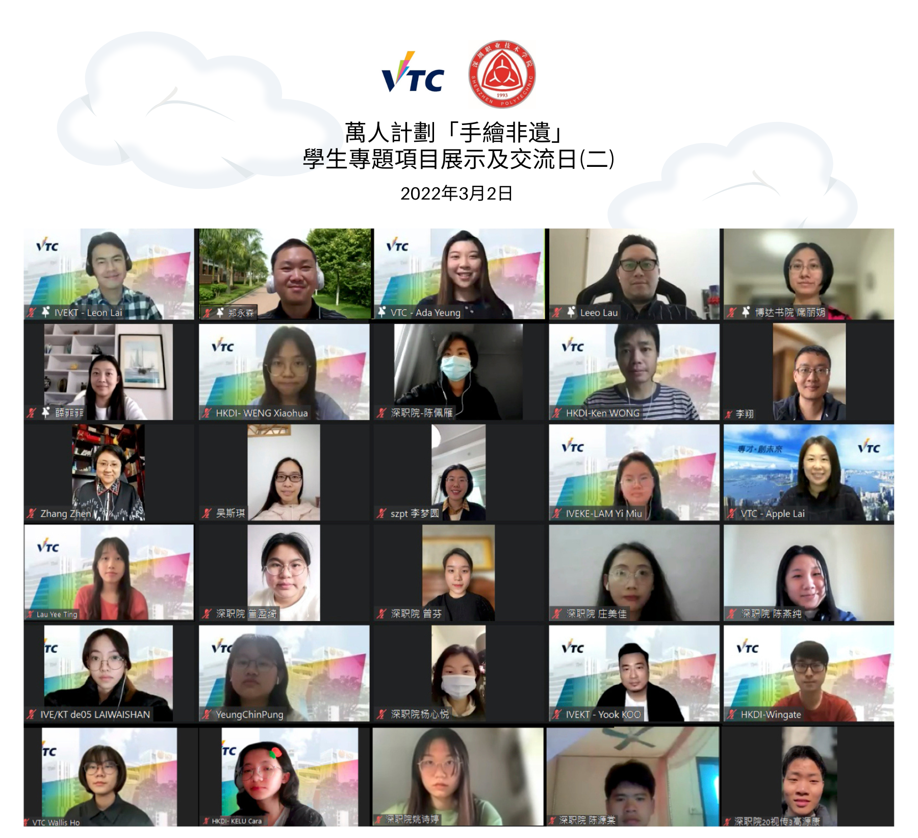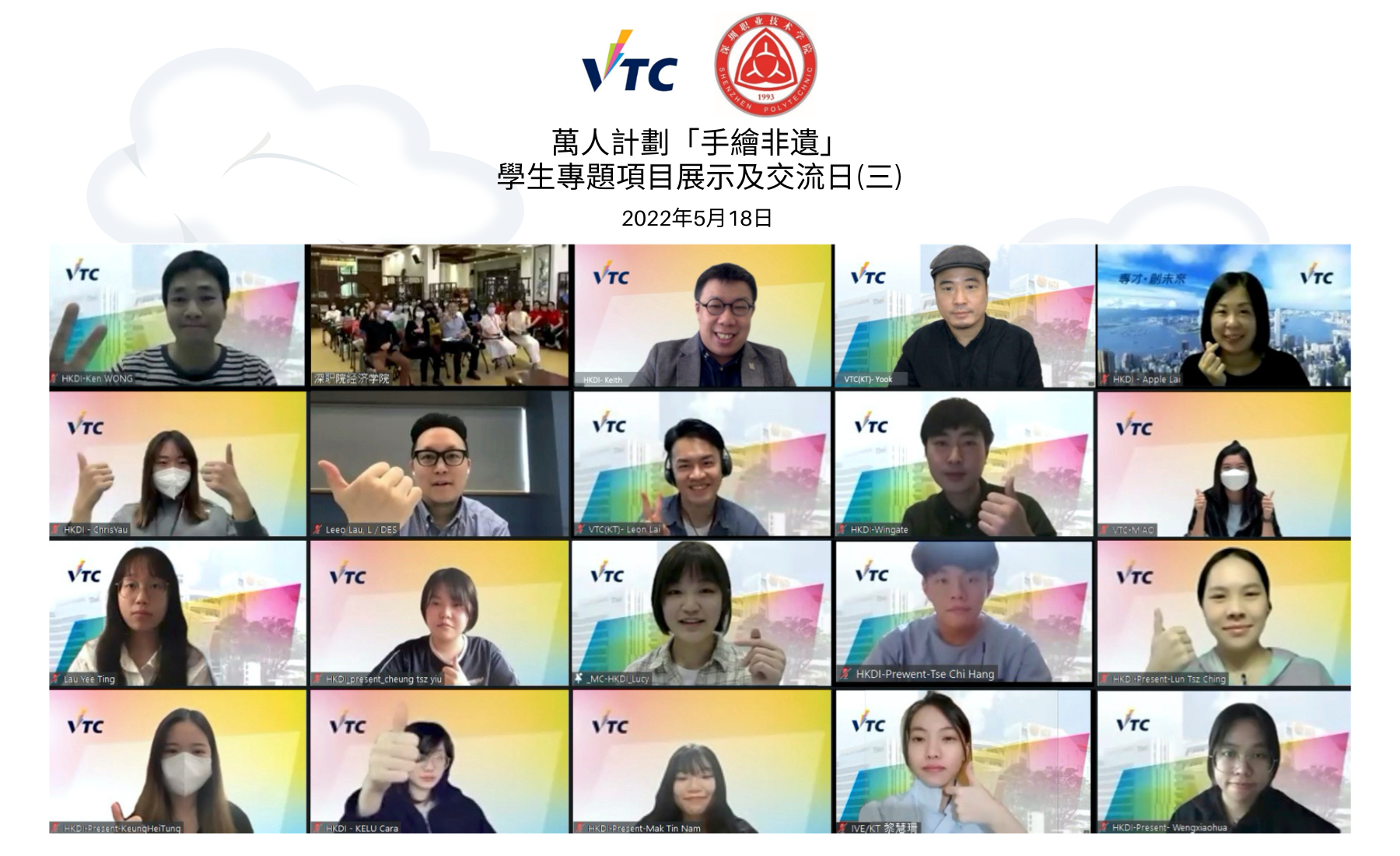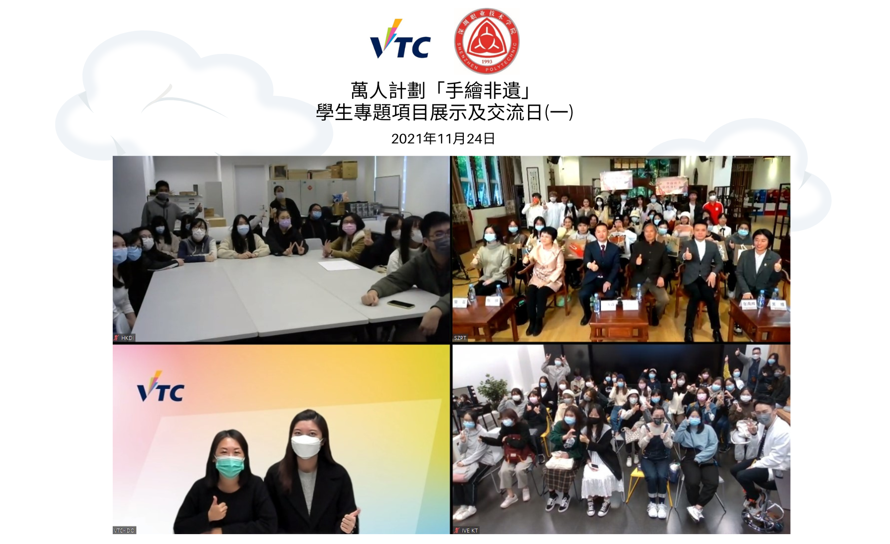 为提高年轻人对非物质文化遗产(非遗)的认识,VTC与深圳职业技术学院(深职院)于2021年11月至2022年5月期间合办了「手绘非遗」学生线上交流系列,共同推动非遗的传承。来自HKDI插画设计高级文凭课程﹑IVE(观塘)基础课程文凭 — 设计课程以及深职院的学生,进行了一系列跨院校﹑跨学术程度的学生艺术交流活动。